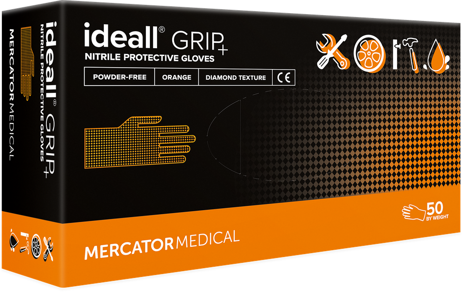 Opis: Jednokratne zaštitne nesterilizovane rukavice bez pudera , granule sa obe strane rukavice;<br> Materijal: nitril, bez pudera;<br> Boja: narandžasta;<br> Manžeta: rub sa porubom;<br> Dužina: 24 cm;<br> Karakteristike: 2,5 puta deblja od standardnih jednokratnih rukavica, obložena granulama za bolje prianjanje;<br> Preporučena područja upotrebe: radovi u industriji , građevini , kontakt sa hranom , mehanički radovi i auto industrija, kućna radinost;<br> AQL: 1,5 u saglasnosti sa ISO 2859-1;<br> CE klasifikacija: Kategorija I - lična zaštitna oprema;<br> Norma: EN420;<br> Dostupne veličine: M - XXL;<br> Pakovanje: kutija od 50 komada;<br> ###<br> Description: Protective and examination non sterile gloves, powder free, diamon textured surface;<br> Material: nitrile, non-powdered;<br> Colour: orange;<br> Cuff: beaded;<br> Lenght: 24 cm;<br> Distinctive fatures: 2,5 × thicker than the standard gloves, daimond structure;<br> Recomended for: construction, industry , food contact, mechanical and automotive industry, assembly works, houseworks;<br> AQL: 1,5 in accordance with ISO 2859-1;<br> CE classification: Category I - Personal Protective Equipment;<br> Norm: EN420;<br> Avialable sizes: M - XXL;<br> Packing: box with 50 gloves;<br>